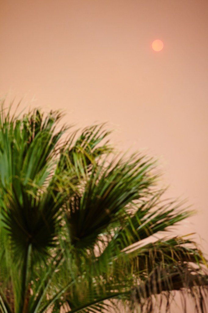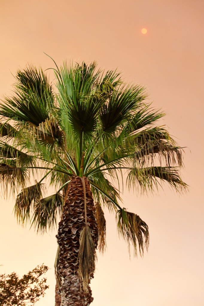 These pictures from the Sand Fire show the eerie red sky, hazy sunlight and odd neon green the palm trees take on when enfolded in wildfire smoke. I keep seeing these colors in the photos and videos from the early days of the 2025 fires. They create a haunting palette and beauty that doesn’t quite lend itself to the danger you are experiencing. The eye sees dawn or dusk, but the body feels the sun is high and hot. The shadows are wrong. That eerie neon green stands out, like a storm is coming. It is an unnerving happening.